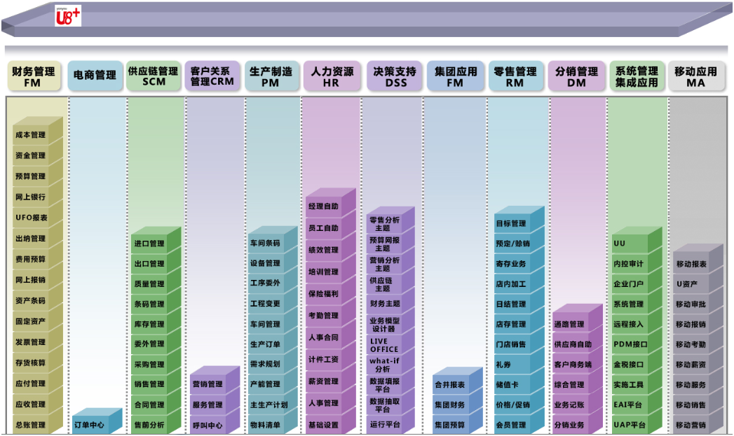 用友U8+经过20多年的市场锤炼,不断贴近客户需求,应对中型及成长型企业客户群的发展,提供的是一整套企业级的解决方案。用友U8+以企业信息化管理解决方案为核心,为成长型企业构建精细管理、产业链协同、社交化运营为一体的企业互联网经营管理平台,助力企业应势而变,赢得未来。U8+全面转向互联网方向,支持移动微商、线上电商、移动销售、线下分销零售等多渠道营销平台,以全新的交互体验、移动体验提高应用交互效率,并通过软硬一体化,产业链协同的策略全面开放的帮助企业在技术创新、商务创新、渠道创新方面提供所需要的应用支持。