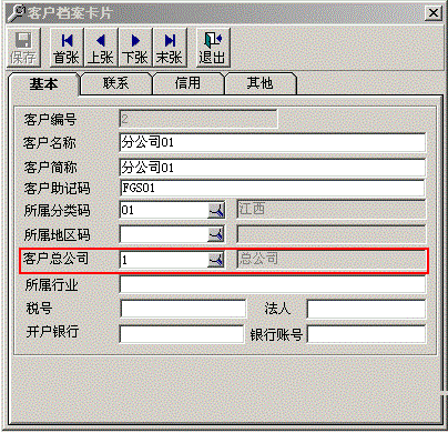 1、分别增加总公司 分公司客户档案,分公司的客户档案中“客户总公司”选择总公司的客户编号