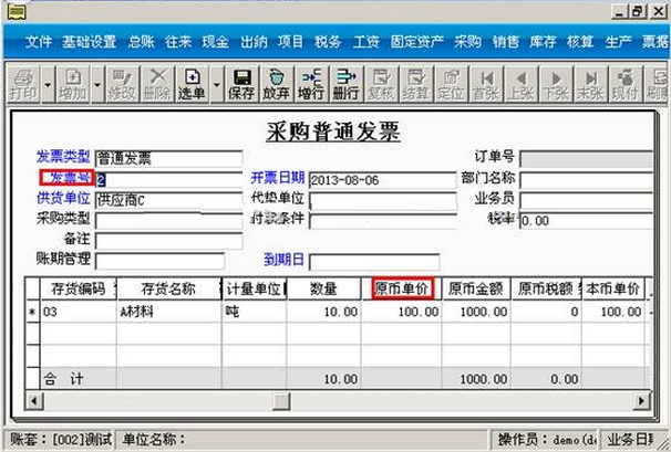 b.输入供货单位和存货及存货数量再点击“保存”-“流转”-“生成普通发票”就会显示以下界面, 输入发票号、存货单价点击“保存”。