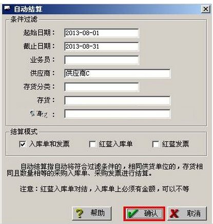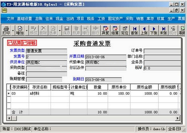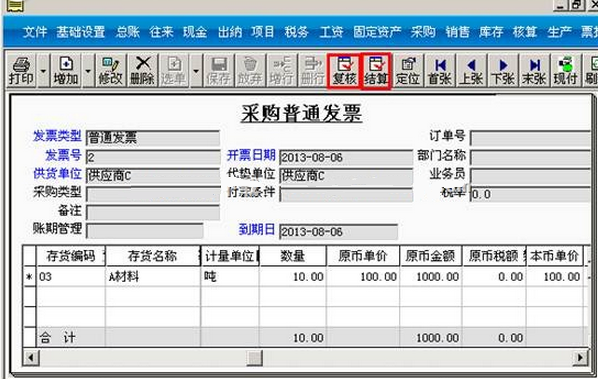 c. 点击“复核”-“结算”-“确定”之后,采购发票和擦过入库单界面就会有“已结算”字样。