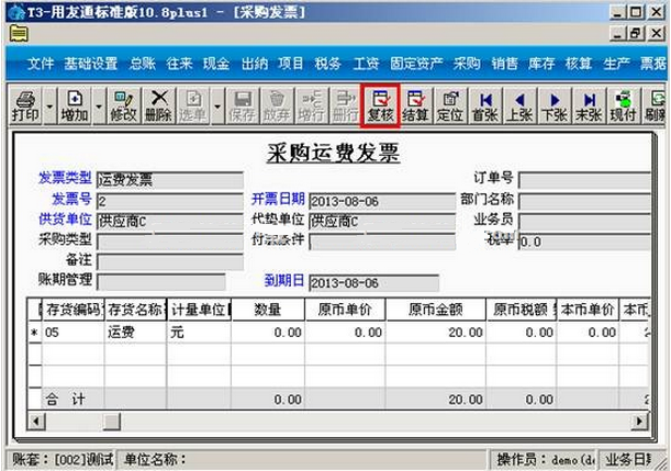 a.点击“采购发票”-“增加”-“运费发票”,输入发票号、供应商、存货及金额之后点击“保存”-“复核”。