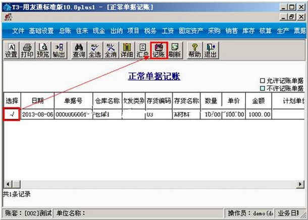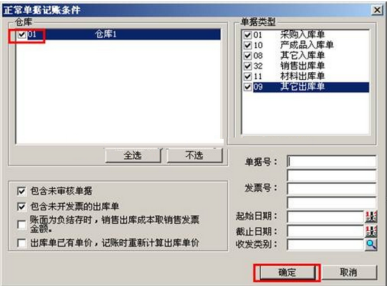 (5)结算完成后,点击核算模块的菜单中的“核算”—“正常单据记账”,选择仓库再点击:“确定”。选择该单据,点击“记账”。