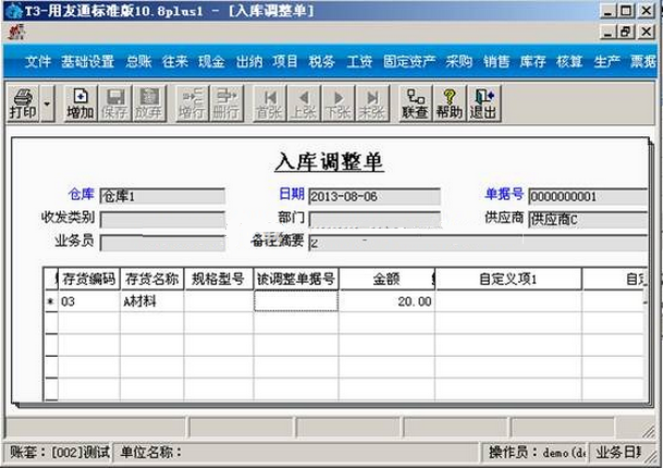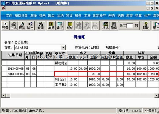 (7)暂估之后自动产生一张入库调整单,同时查询明细账时多出一条只有金额的记录,该存货的结存单价和金额发生变化。点击“核算”-“入库调整单”。