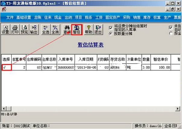 (6)点击核算模块的菜单中的“核算”—“暂估入库成本处理”,选择仓库点击“确定”。选择单据点击“暂估”按钮。