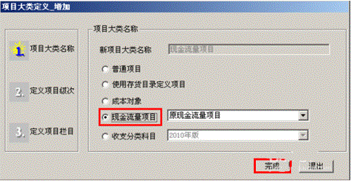 2、点击“增加”,选择“现金流量项目”,再点击“完成”,提示“预制完毕”,点击“确定”