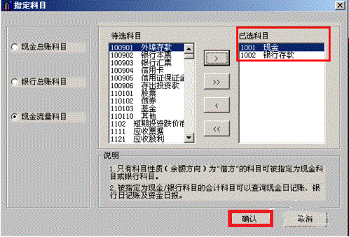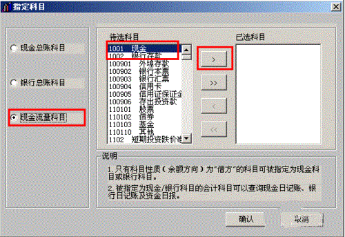 4、在会计科目中点击“编辑”-“指定科目”,在“现金流量科目”中把“现金”和“银行存款”移到右边已选科目栏,点击“确定”