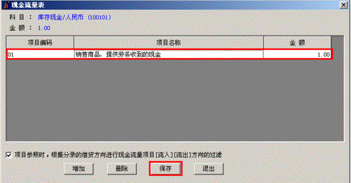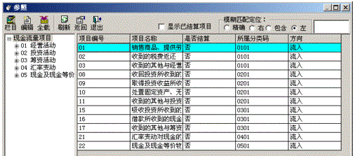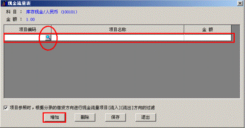 6、在现金流量表中点击“增加”,然后在“项目编码”的下面点击小放大镜,在参照中选择对应的现金流量项目