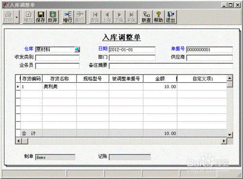 5、此时如果收到采购运费票据10,需要在核算管理中填制“入库调整单”(点击“核算”-“入库调整单”)