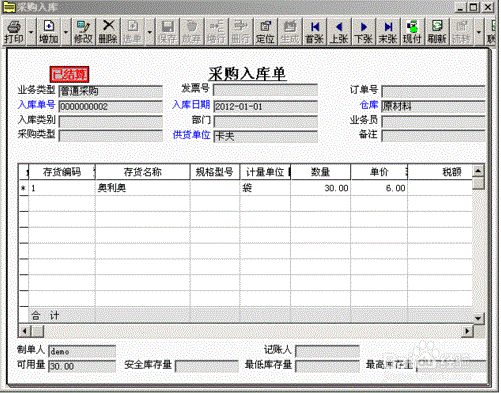 1、举例:采购货物一批,填制采购入库单保存后软件自动生成采购票据并结算