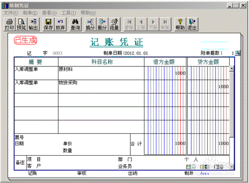 6、入库调整单保存后自动记账。在核算模块的购销单据制单对“入库调整单”生成相应的凭证