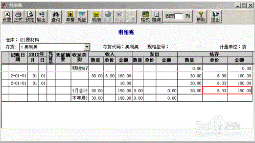 7、查询明细账,采购运费10,分摊到存货的单价中。此时原材料成本为30*6.33=190已将10元运费分摊到每一个原材料中