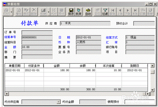 8、对于10元运费如果需要确定应付,可以到采购管理中填制应付款(“采购”菜单 –“供应商往来”- “应付单” ),并形成应付凭证:借:物资采购 贷:应付账款;而后续付款时可以到采购管理中填制付款单并核销