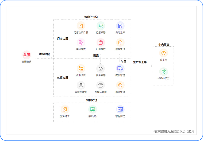适用场景:连锁餐饮企业,在企业的经营过程中,需要点餐收银系统、会员系统、供应链系统、中央厨房、财务管理等进行一体化管理。