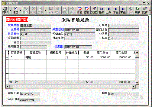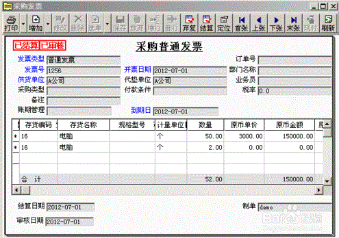 2、流转生成普通采购票据,点击“结算”按钮将“采购入库单”与“采购票据”进行结算。