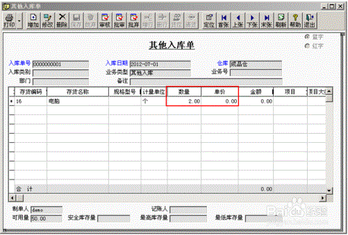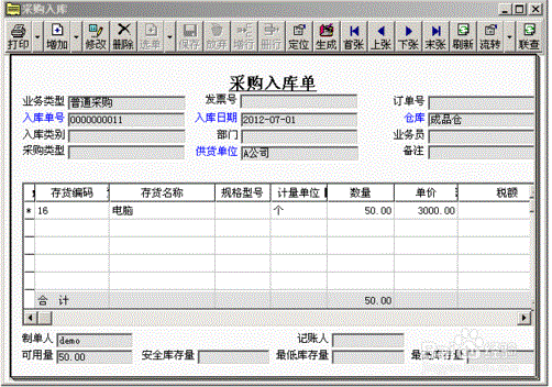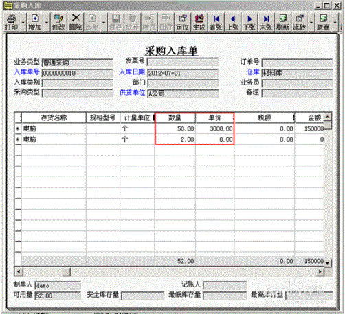 1、填制采购入库单,电脑50台,单价3000元,再录入2台赠品,单价为0