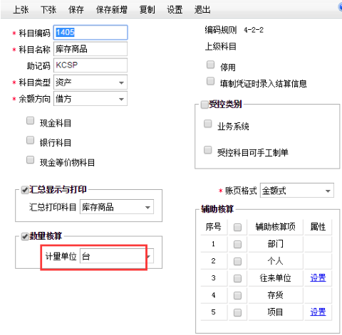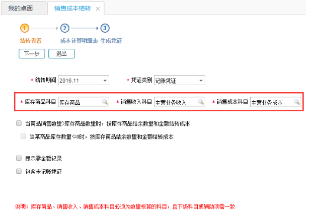 库存商品、销售收入、销售成本科目必须为数量核算的科目,且下级科目或辅助核算项需一致。