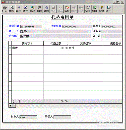 4、点击票据上“代垫”按钮,填制100元的运费代垫费用单