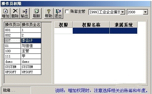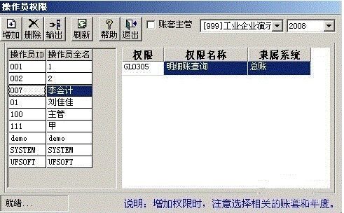 2、选中该操作员和账套,点击“增加”按钮(以操作员007,账套999为例)