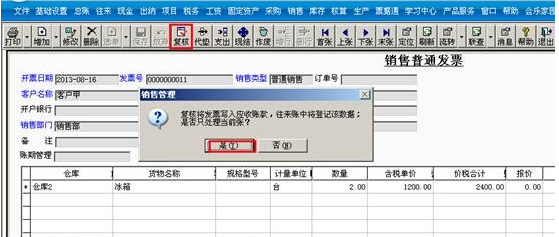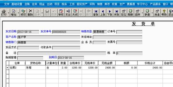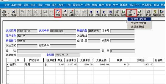 1、打开用友T3财务软件,点击销售管理模块,填写一张销售给客户甲2台冰箱的发货单并流转生成销售发票,对销售发票进行复核;