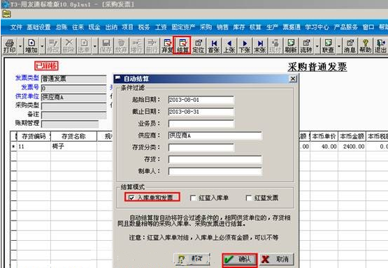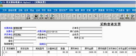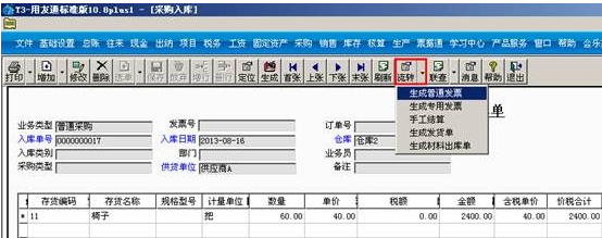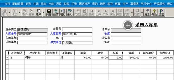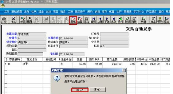 2、向供应商A购买椅子,填写一张采购入库单并流转生成采购发票,并对采购发票进行复核后结算;
