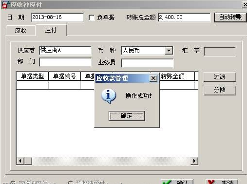 本企业销售给客户甲冰箱2台,单价为1200元,应收款为2400元;而之前向供应商A购买了60把椅子,单价40元,应付款为2400元,现在想把应收账款甲的2400元冲抵应付供应商A的2400元,这项业务在用友通T3财务软件中如何体现?