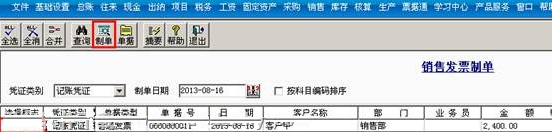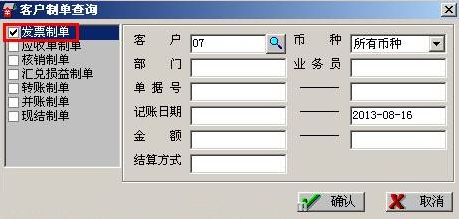 7、点击客户往来制单,选择“发票制单”,选择好客户甲,点击“确认”后并制单;