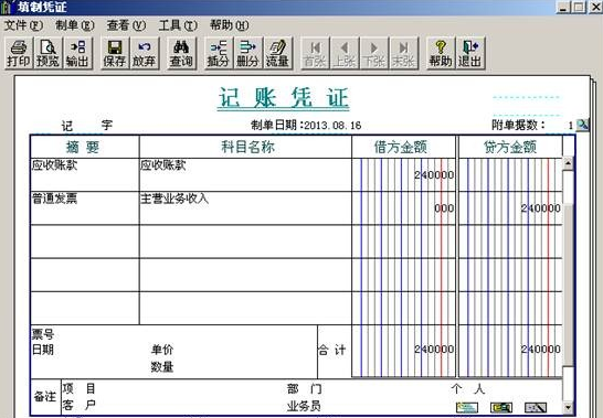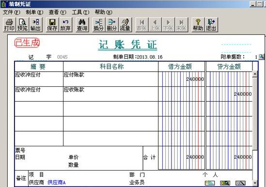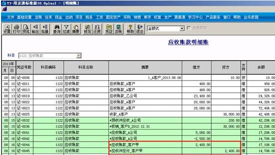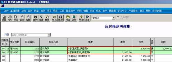 9、业务完成后,我们来查看一下总账的明细账如下:可以看出客户甲的应收账款为0(借方2400元,贷方2400元),供应商A的应付账款余额也为0(贷方2400元,借方2400元);