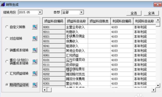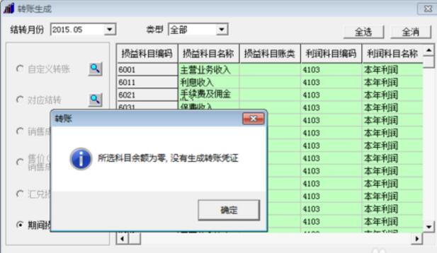 6.选择左边的期间损益结转,这样就会带出设置好的科目公式。左上角要选择结转的月份,右上角要点击一下全选,如何没有记账的话,要把左下角的“包含未记账”给打上勾。最后点击确定就可以生成结转的凭证了。
