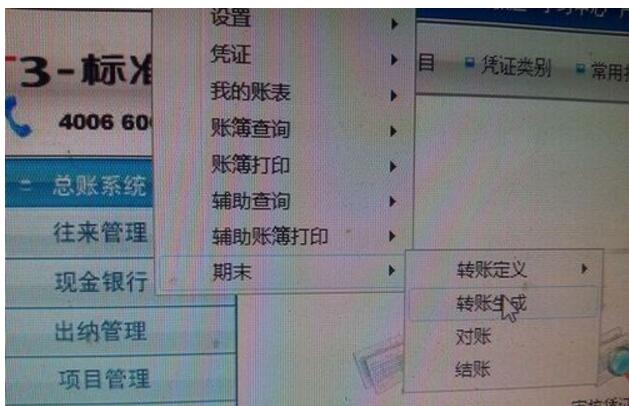 5.公式设置好了之后,就点击总账——期末——转账生成,或者直接在大界面上找到“月末结转”。双击即可出现一个对话框。