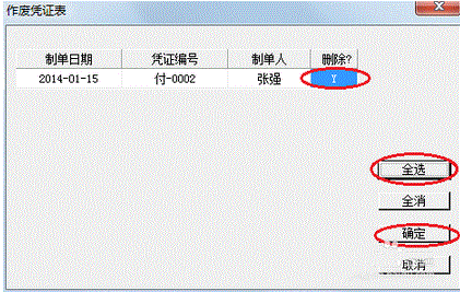 6、在“凭证作废表”对话框中选中“付字0002”号凭证,也可以点击“全选”按钮。如图点击“确定”。