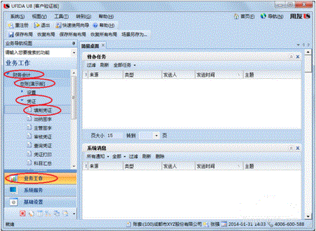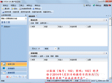 2、同样使用张强(编号:102;密码:102)的身份于2014年1月31日的操作日期使用100账套登录到“企业应用平台”。(登录方法详见本系列第9篇经验)