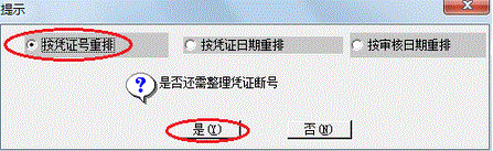 7、在如图“提示”对话框中选择“按凭证号重排”后点击“是”。系统便完成了对凭证号的重新整理。
