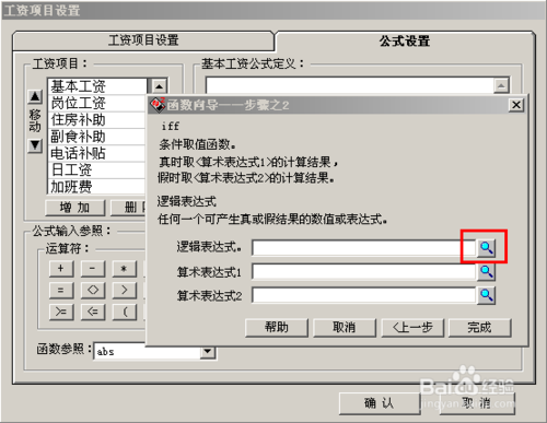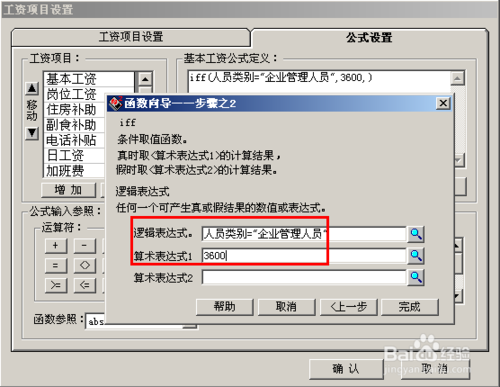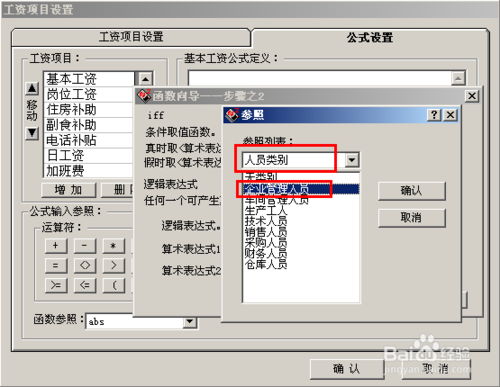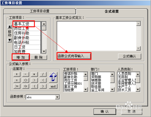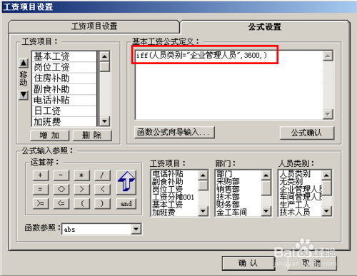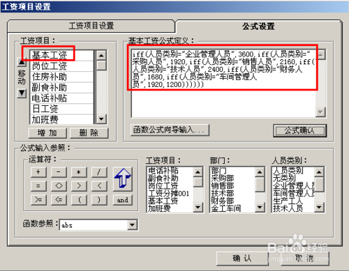1.点击“工资”——“设置”——“工资项目设置”,打开工资项目对话框后,点击“公式设置”的页签。点击“增加”将“基本工资”的工资项目显示出来,然后在右侧设置公式。公式为:iff(人员类别="企业管理人员",3600,iff(人员类别="采购人员",1920,iff(人员类别="销售人员",2160,iff(人员类别="技术人员",2400,iff(人员类别="财务人员",1680,iff(人员类别="车间管理人员",1920,1200))))))。选择好工资项目,点击“函数公式向导输入”进行设置公式
