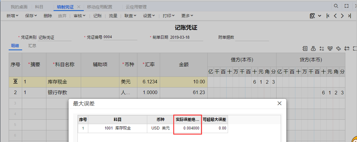 最大折算误差,是因为有汇率和外币换算成人民币,换算之后会四舍五入导致误差,如下图所示,汇率是6.1234,外币金额为10,那么人民币金额为6.1234*10=61.234,而金额的小数位数是2位,所以只保留了61.23,这样就会有61.234-61.23=0.004的误差。