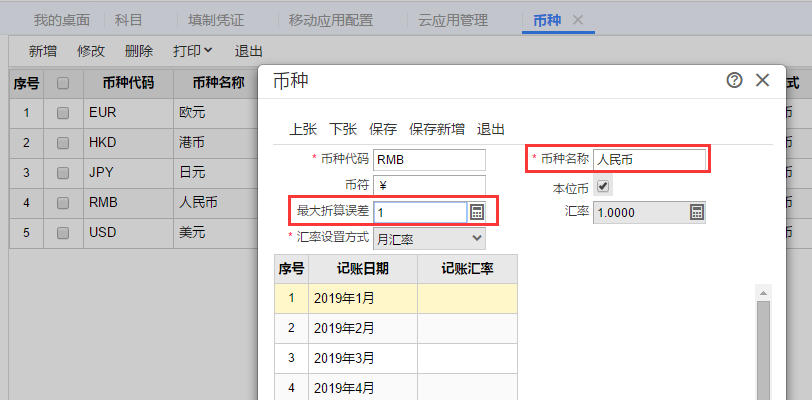 在币种界面,只有本位币才能修改最大折算误差,非本位币不能修改,请确认是否为本位币。