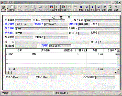 2、填制发货单并生成销售出库单