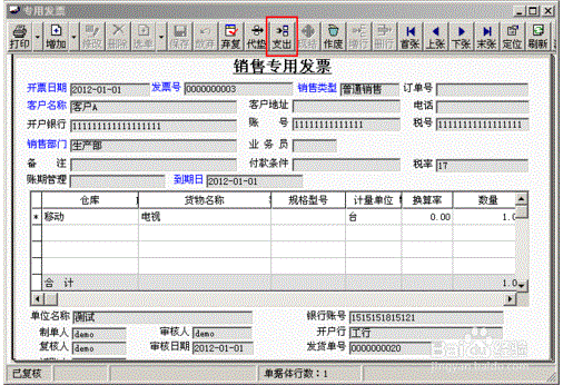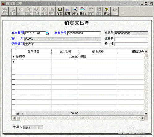 4、点击票据上“支出”按钮,填制销售支出单