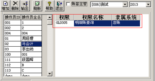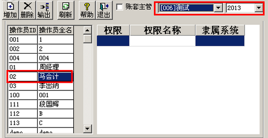 (2)先选中账套,再选中操作员,点击“增加”按钮(以操作员02,账套006测试为例):