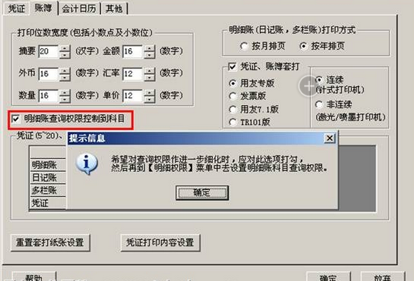 (4)打开用友T3财务软件依次点击“总账”-“设置”-“选项”-“账簿”,勾选“明细账查询权限控制到科目”:
