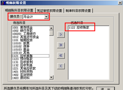 (5)依次点击“总账”-“设置”-“明细账权限”菜单,为该操作员选择查询科目