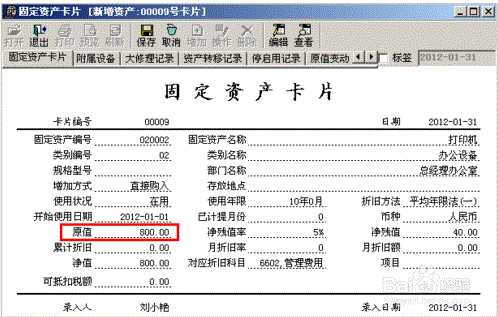 1、点击“资产增加”,增加一张固定资产卡片,原值800,为暂估