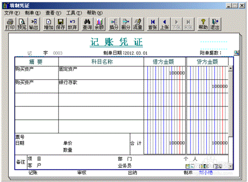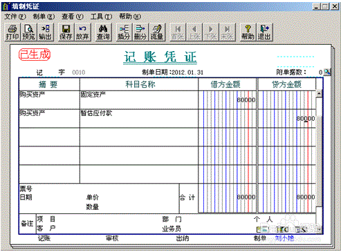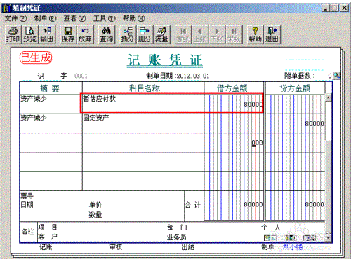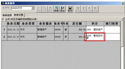 2、对新增资产制单,将自动带出的银行存款科目修改为“暂估应付款”,新增固定资产本月不计提折旧,本月没有计提折旧的凭证