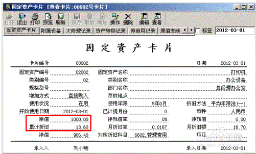 7、在2月份对暂估固定资产计提折旧为13.6,那么新增资产原值为1000,累计折旧为13.6