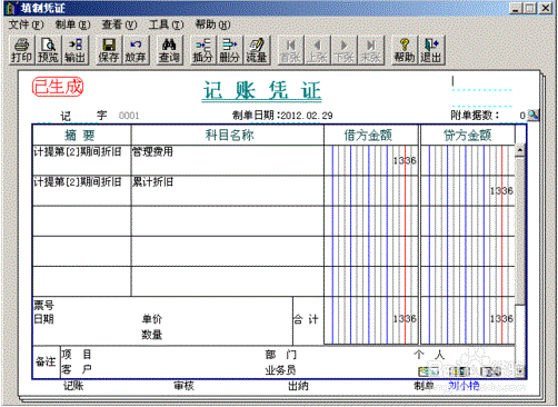 3、一月份正常结账,对2月份进行计提折旧,将该卡片的2月份计提折旧进行制单