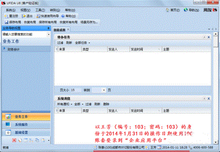 2、以王芳(编号:103;密码:103)的身份于2014年1月31日的操作日期使用100账套登录到“企业应用平台”。