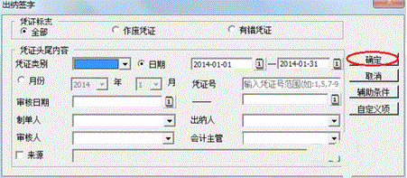 4、如图在弹出的“出纳签字”对话框中点击“确定”。(这个对话框的作用主要是在凭证量较大的时候对凭证进行筛选,只显示需要的凭证)