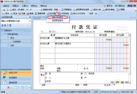 10、如果需要对凭证批量签字,只需要在如图“出纳签字”界面,点击工具栏的“批处理”的下拉三角箭头,选择“成批出纳签字”即可。