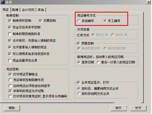 依次点击“总账”-“设置”-“选项”菜单,勾选凭证编号方式为“手工编号”