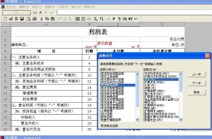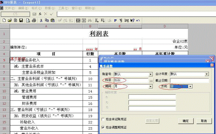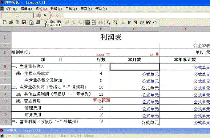 在格式状态下,选中报表单元格之后,点击fx按钮或者数据菜单中编辑公式-公式单元使用函数向导定义公式,选择用友财务函数,选择对应账套,年度,科目,期间,方向即可。